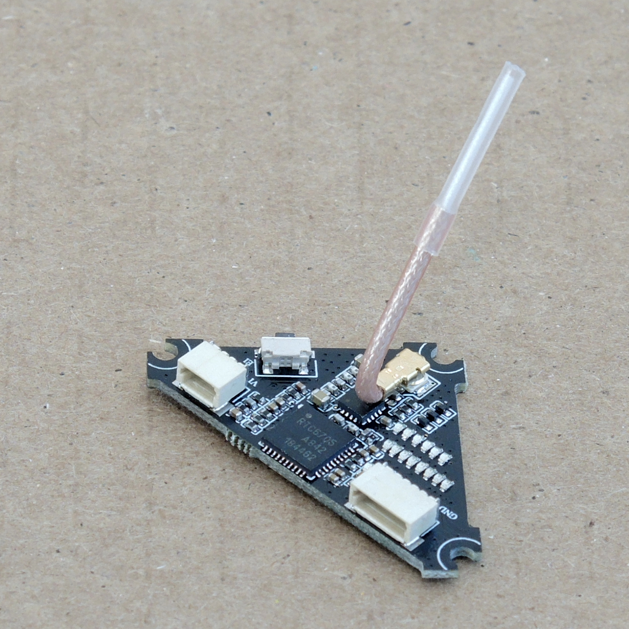 Единственный минус у полетного контроллера - антенна расположена снизу. Не думаю, что это добавит дальности управления, поэтому сразу же перепаял антенну на верхнюю часть платы и заправил под канопу. Заодно перепаял силовые провода, чтобы они не торчали сбоку.